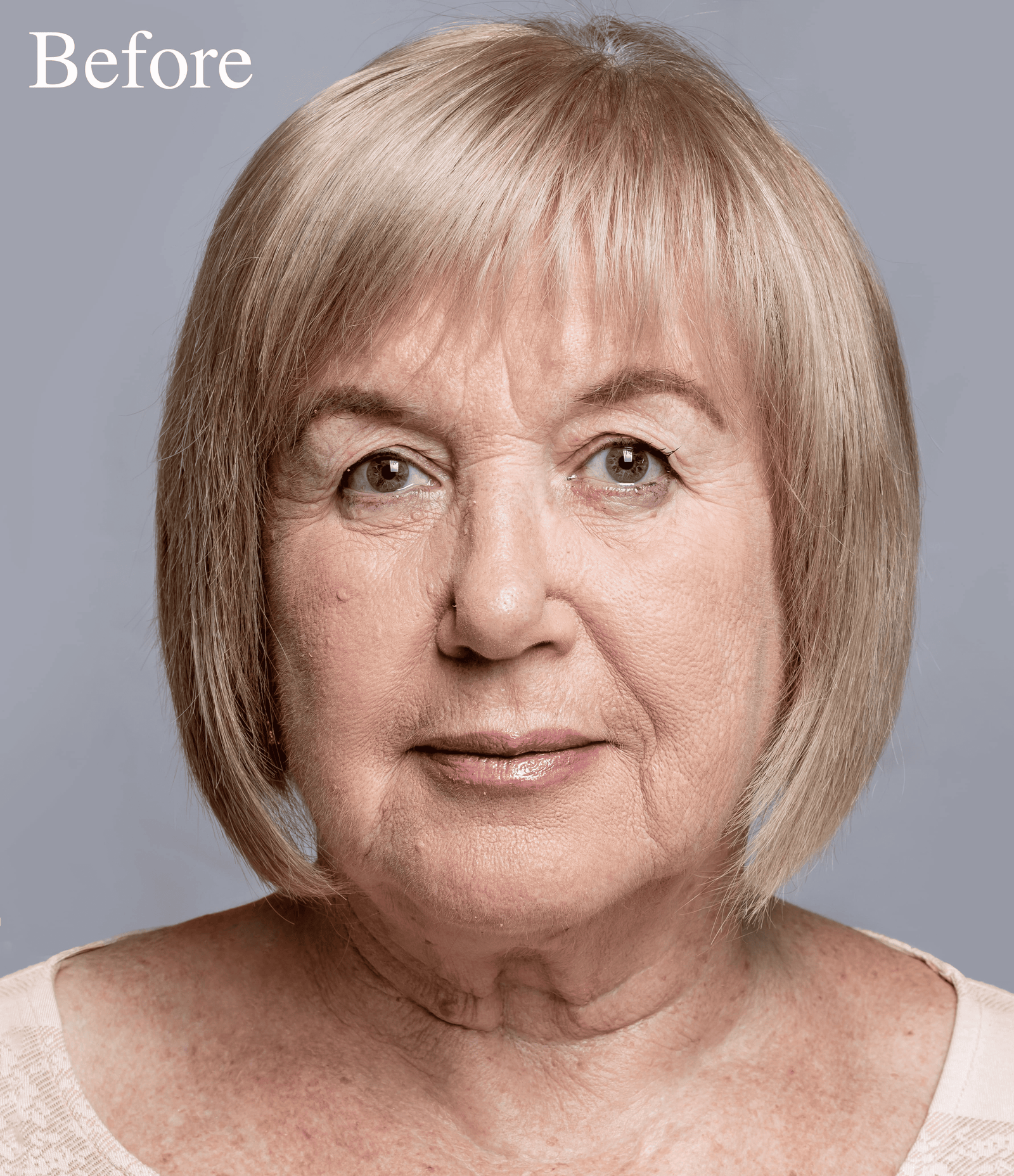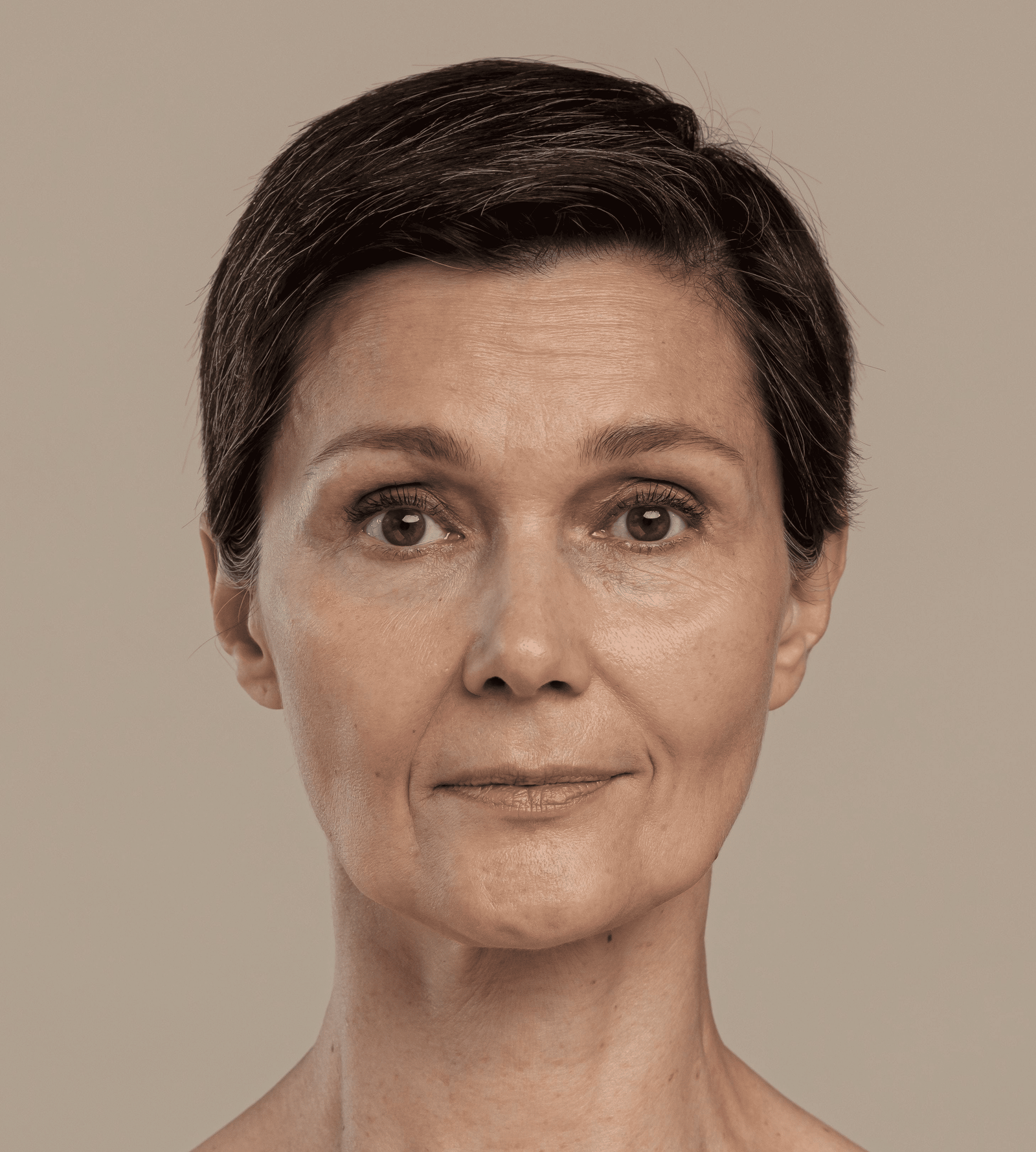- zmarszczkach mimicznych, drobnych liniach, głębokich zmarszczkach, opadających powiekach, workach i cieniach pod oczami, zwiotczałym podbródku, niedoskonałościach i przebarwieniach skóry